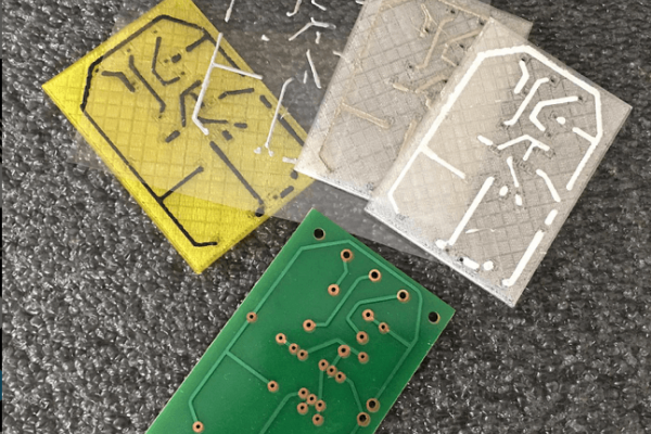 將混合電子 3D 打印用于 2D 打印應(yīng)用程序。在印刷電路板上用金色油墨打印。用銀漿打印互連。在玻璃上制作一個(gè)線性空間陣列,在卡普頓上打印線圈??赡苄允菬o限的。